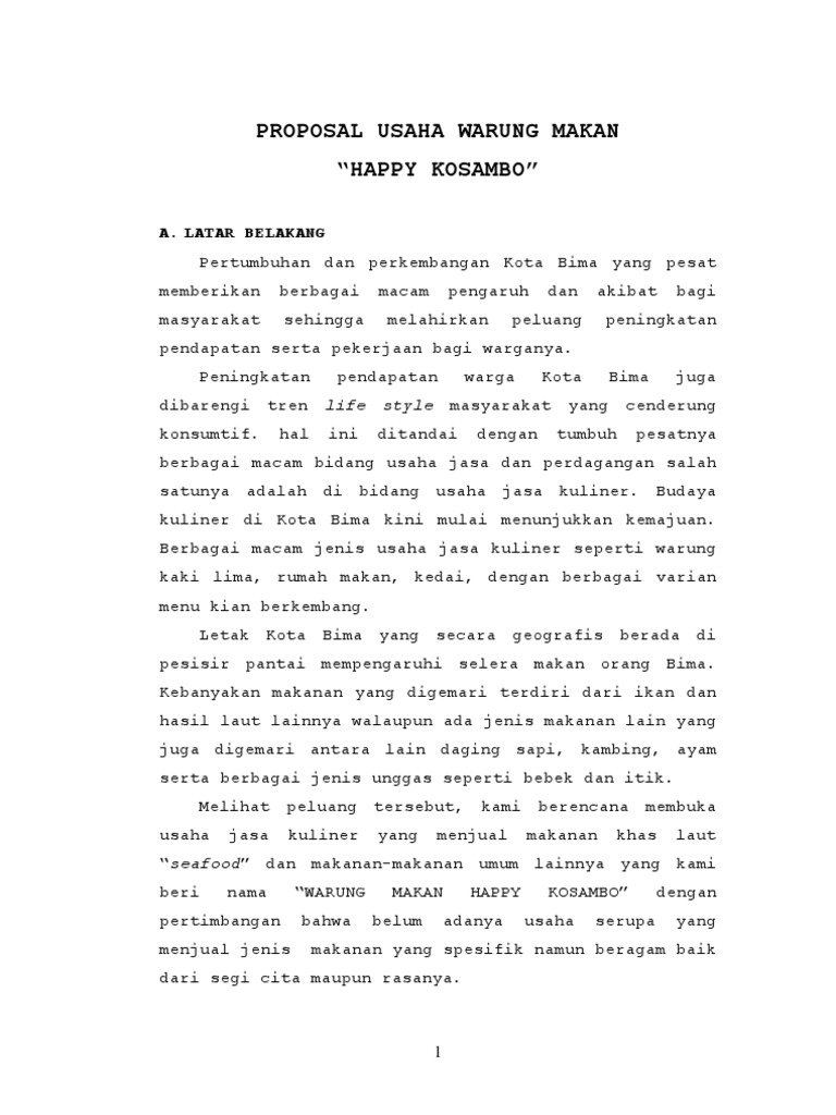 Contoh Proposal Usaha Makanan from data03.123doks.com Untuk sebagai inspirasi usaha makanan apa saja yang bisa anda jalakan dibawah ini ada contoh proposal usaha makanan yang bisa anda. Nama usaha yang akan kami buat sangat diperlukan karena agar mudah diingat oleh setiap konsumen yang membeli produk kita.untuk usaha ini kami memberikan nama nurii puding yang kami ambil dari singkatan nama tim pelaku bisnis kami. Berikut ini gambaran contoh proposal pengajuan dana usaha catering makanan, ada perhitungan sebagai gambaran untuk memulai usaha tersebut. Dari masakan padang, sunda, jawa, dan lainnya. Hal ini merupakan sebuah peluang bagi orang yang jeli. Kebutuhan hajat hidup terletak pada kemampuan dan keseriusan pemerintah dalam menata pondasi ekonomi masyarakat sebagai sumber yang. Apalagi kebutuhan konsumi di indonesia ini sangat tinggi sekali. Contoh proposal pengajuan menu makanan :